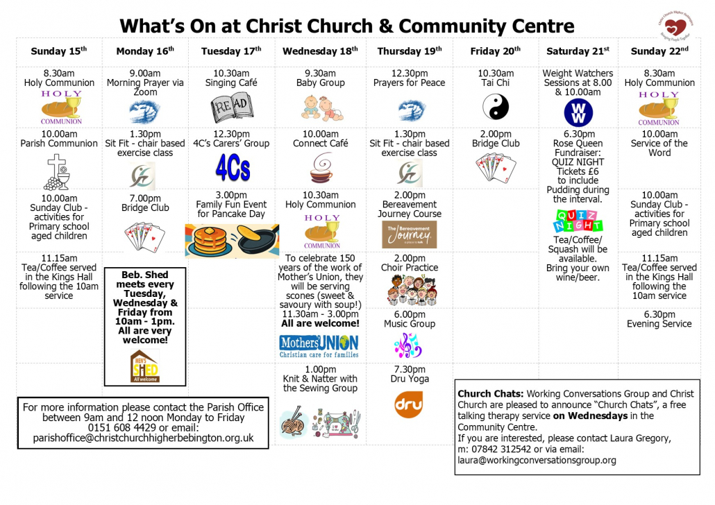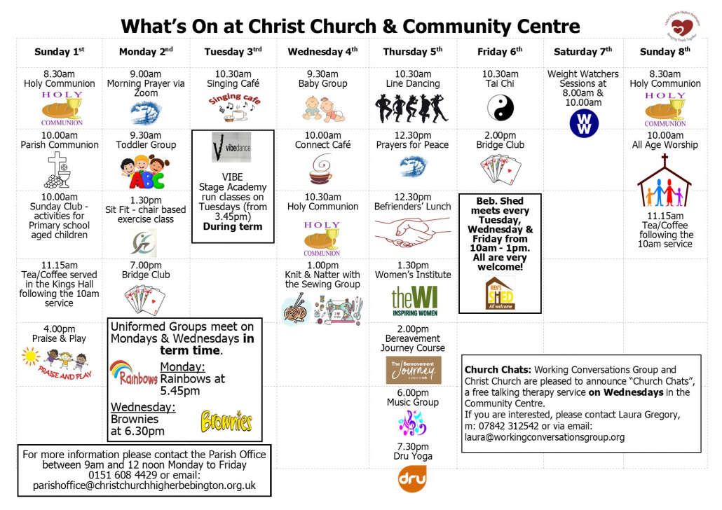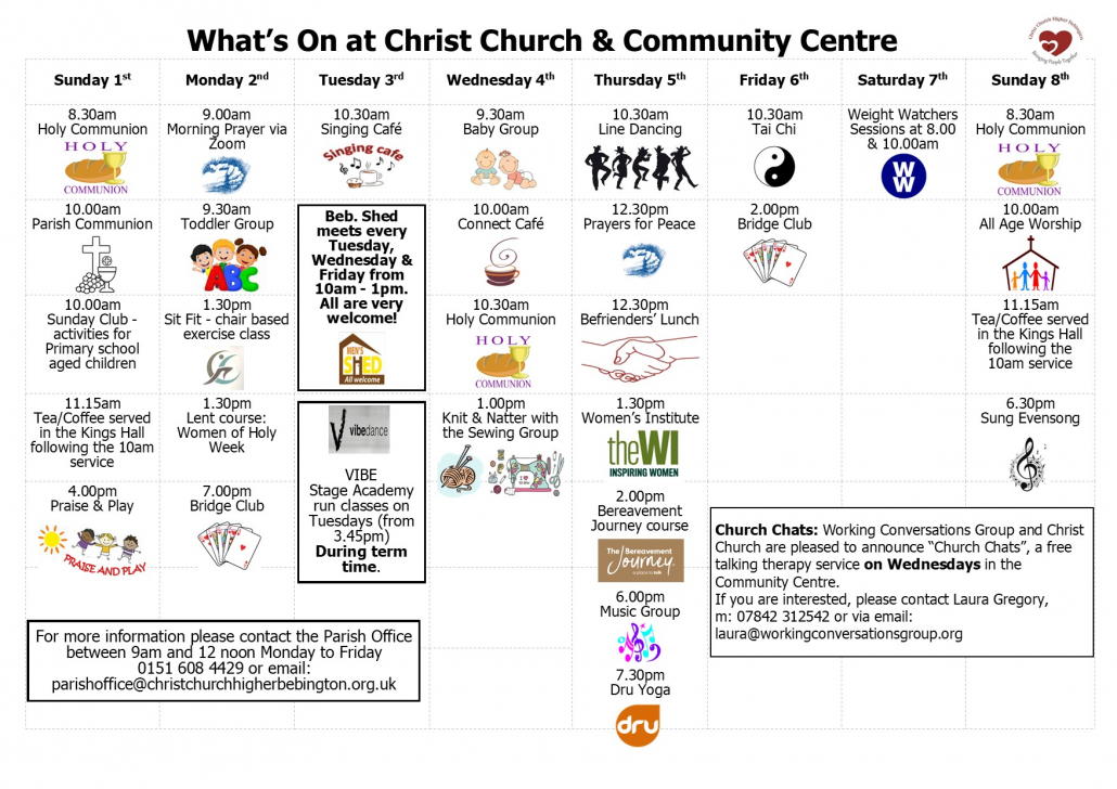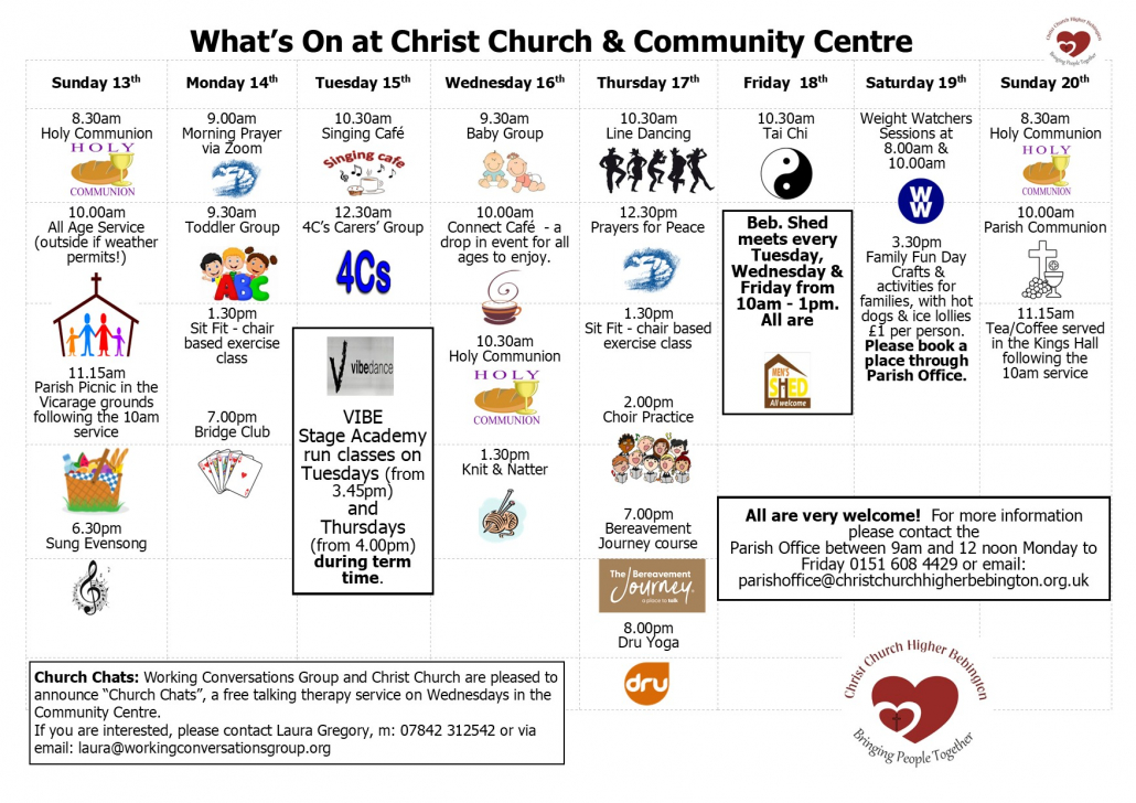 Christ Church Community Centre is located on Kings Road, Higher Bebington, Wirral. It is a fully accessible building with a 5 Star food hygiene rating.